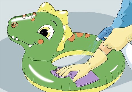 Sanitize pool equipment and toys. Wipe down all your toys, floats, and cleaning equipment with a non-bleach disinfectant. This will kill any algae that's hiding out on these items, and prevent the algae from blooming again. Items to clean include: Vacuum Brushes Noodles Floats Balls and water sport equipment