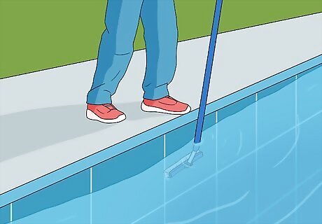 Brush the pool. After 24 hours with algaecide in the pool, the water should be nice and clear again. To make sure you remove all the dead algae from the sides and bottom of the pool, brush the entire surface of the pool. Brush slowly and thoroughly to ensure you cover every inch of the pool's surface. This will prevent the algae from blooming again.