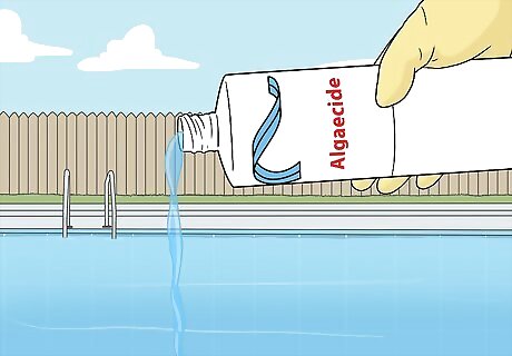 Add algaecide. For mustard and black algae, it's important to use copper-based algaecides. Ammonia-based ones will not be effective against these types of algae. Use an algaecide with at least 30 percent active ingredient, and you may want to go as high as 60 percent. After adding the algaecide, let it sit overnight.