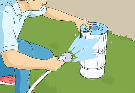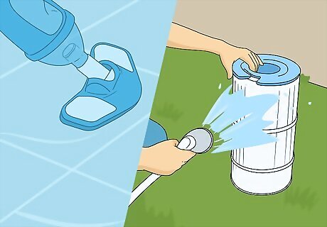 Vacuum and clean the filter. Once the algae are dead, vacuum the pool thoroughly to remove all the dead plant matter. When the pool has been vacuumed and the water is clear, clean the filter. Rinse the cartridge, backwash the filter, and clean the filter with filter cleaner.