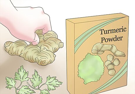 Eat kidney “super foods”. Some foods are more kidney-friendly than others. In particular, there are three herbs—coriander, parsley, and turmeric—and two root vegetables—garlic and ginger—that are great for the health of your kidneys. Coriander and parsley: Both of these herbs help to cleanse your kidneys. You can add them to your food, take extracts, or drink their juices. Turmeric: Turmeric contains curcumin, antibacterial, antifungal and anti-inflammatory properties. You can drink turmeric tea or take supplements. Garlic: Garlic contains allicin, that has antibacterial, antifungal, and anti-inflammatory properties. You can add more garlic to your diet, eat the cloves, or take garlic supplements. Ginger: Ginger contains gingerols, which work in a similar fashion to allicin and curcumin. You can eat raw ginger, add it to means, drink ginger tea, or take supplements.