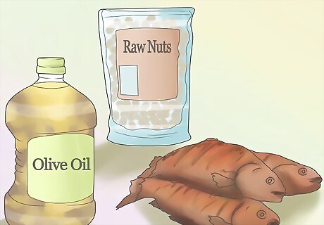 Eat natural unsaturated fats, rather than saturated fats. Unsaturated fats lower the amount of bad cholesterol in your body and can help to cushion your kidneys. Saturated fats, on the hand, contain cholesterol and can harm your body if you eat them a lot. Stick to unsaturated fats for the most part. Examples of unsaturated fats: Vegetable oils like olive oil, raw nuts, fish, salmon, tuna, and flaxseeds. Examples of saturated fats: Animal products like red meat, cheese, and lard. Coconut and palm oil are also forms of saturated fats, though they do not contain cholesterol like animal products do. Red meat also increases your chances of developing kidney stones.