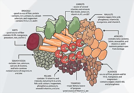 Get lots of brain-healthy foods. Certain foods may help slow down the degeneration of your brain functions during the early stages of Huntington’s disease. Try to incorporate some of these brain-healthy foods into every meal, or talk to your doctor about using supplements. Some of the best brain-healthy nutrients include: Vitamin B12, which you can get from eggs, dairy, and meat products. Antioxidants, which are found in colorful fruits and vegetables (such as berries, peppers, citrus fruits, tomatoes, and leafy greens). Omega 3 fatty acids and other healthy fats, which you can get from foods like fish, nuts and nut butter, avocadoes, and vegetable oils.