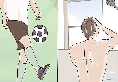 Keep yourself cool while you work or exercise. Overheating can also cause rhabdomyolysis, so use caution while you exercise or work in hot environments. Besides drinking enough water, take periodic breaks to cool down if you’re hot. Go somewhere cooler or sit in the shade to help lower your body temperature. If you work outside in hot weather, try taking cool showers when you get home. Firefighters who have just entered a burning building are at a higher risk for rhabdomyolysis. Monitor your condition closely if you’re a firefighter.