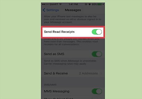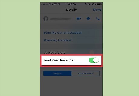 Tap the green switch next to "Send Read Receipts". If this switch is grey, your read receipts are already disabled.