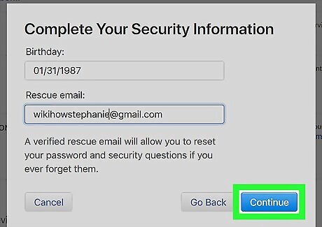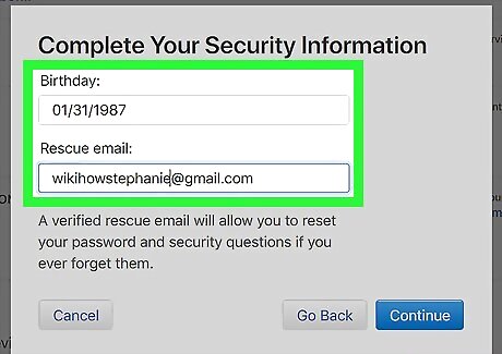 Enter your birthday and rescue email. The rescue email is an alternative email address that will allow you to reset your password if you ever forget your security questions.