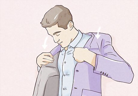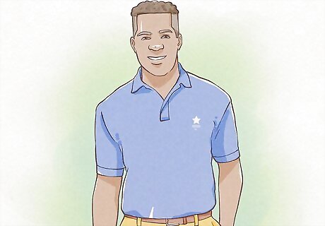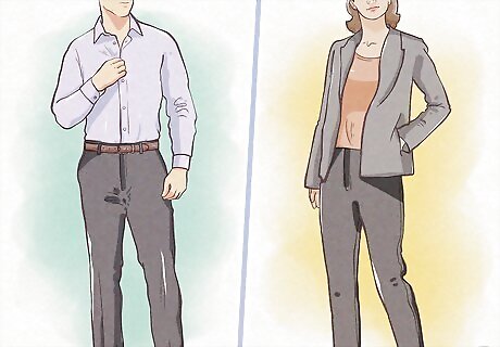 Interpret “business casual.” Some dress codes use the vague phrase “business casual” but don’t supply examples. You can generally interpret business casual to mean the following: Men can wear dress pants or khakis paired with a sweater, button-up dress shirt, or shirt with a collar (such as a polo). Men can also wear a sport coat and casual dress shoes. Women have more options—and more ways they can appear too casual. Generally, women should wear dress pants or a skirt coupled with a sweater, blouse, or blazer. Women should wear pumps, flats, or open-toed shoes. Remember that business casual clothing must always be clean and pressed. Don’t show up in a wrinkled pair of khakis and a polo shirt with a mustard stain on the front. It is better to buy the best quality clothes you can afford. Pay attention to your shoes, always keep them buffed and clean. Wear a nice gold or silver watch that looks semi expensive.