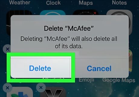 Tap Delete App. A confirmation message will appear. If you're looking at a screen full of wiggling icons, tap the X at the top corner of McAfee.