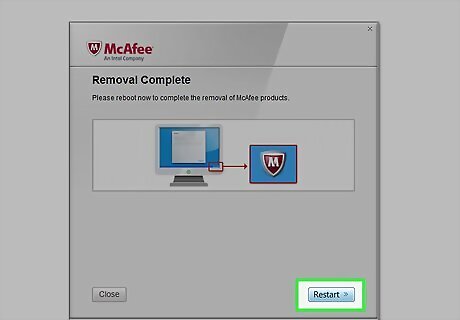 Click Restart when the removal is complete. This reboots your PC to complete the process. If this doesn't remove McAfee, reboot your PC and run the tool again. If it still doesn't work, you'll need to contact McAfee for further instructions. Visit https://service.mcafee.com/webcenter/portal/cp/home/contact to do so.