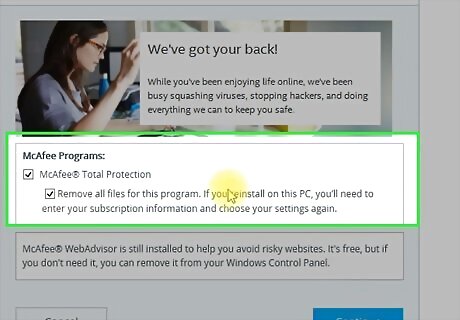 Check the boxes next to the items you want to remove. If you want to keep your subscription information in case you want to reinstall McAfee in the future, don't check the box next to "Remove all files for the program."
