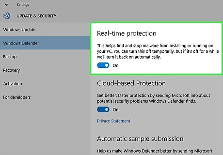 Set up a new antivirus/antimalware program. Removing McAfee can leave your computer exposed to viruses and other threats. If you're using Windows 10, you can use these steps to enable Windows Defender, the built-in antivirus/antimalware suite: Open your Windows Settings. You'll find it in the Start menu. Navigate to Update & Security > Windows Security. Click Open Windows Security. Click Virus & threat protection in the left panel. Click Manage settings under "Virus & threat protection settings." Slide the "Real-time protection" switch to the On position.