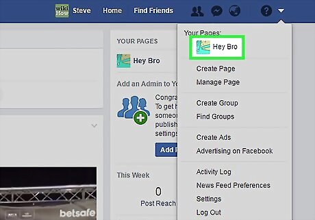 Click the downward-facing arrow. It's in the top right corner of your Facebook page, directly to the right of the padlock icon. You can also click Pages on the left-hand side of the Facebook window and then click Your Pages in the top right corner of the page to view your pages.