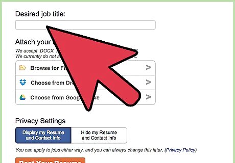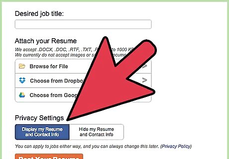 Chose your Privacy Settings (display or hide your resume and contact info) and go to the next page by selecting "Continue". This action brings you to the "Sing up" page.