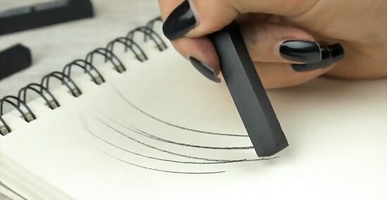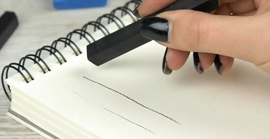 Hold the stick like a pencil and use the edge to make small marks. To make small, accurate marks, hold the stick vertically in your hand like you’re holding a pen or pencil. Angle the stick so that the corner where the long edge meets the 2 short edges is pressing against your paper. Use this sharp corner to make longer, or smaller marks. If you want to make long, even lines, keep your wrist still while moving your entire forearm across the page. As you wear the corner down, readjust your stick to use a different corner. Most artists reorient the stick after a couple of strokes to ensure that they are using an appropriate corner of the stick.
