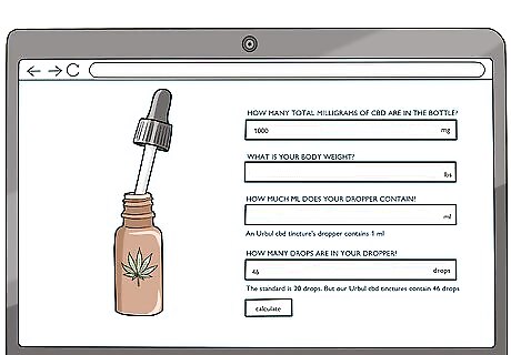 Try an online calculator if you want a more precise dose. Do a quick online search for CBD dosing calculators, which are typically offered by sites that sell CBD products. Then, enter how many mL of oil the bottle has, how many mg of CBD oil the product contains, and how much you weigh. Using this information, the calculator will estimate how much oil you need in each dose. If you buy your CBD oil online, check the website to see if they have their own calculator. This will help you get the most accurate dosing.