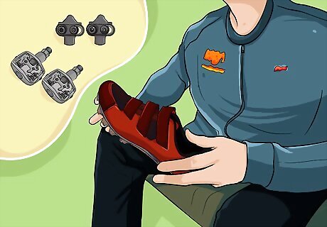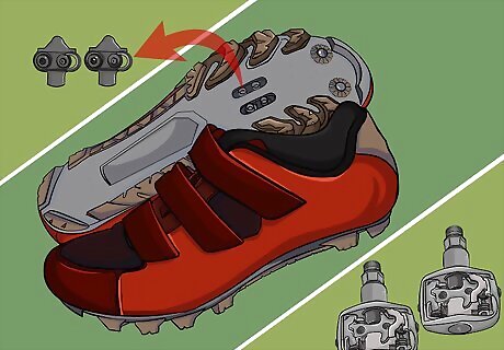 Attach the cleats to your cycling shoes. It’s important to have shoes that are made specifically for cycling because they are made to fit the cleats. Having an expert attach your cleats can be helpful to make sure they are angled on the shoes correctly. Most bike shops should have someone who can help you with the process. The centerline of your shoe is not exactly the same as the centerline of the cleat, which is why it can be helpful to have someone more experienced attach them. Cycling shoes will have small holes in the bottom where the cleat screws onto the shoe. The exact placement of the cleats is partly personal preference, so if you attach them and try them out on the pedals, you can adjust them if they don’t feel quite right.