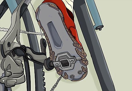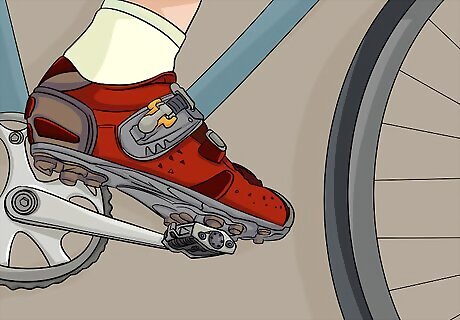 Push the cleat into the pedal until you hear a click. The cleat and pedal attach to each other to hold your foot in place. When the mechanism engages, you’ll hear and feel a click with lets you know you’re clipped in. It’s best to clip in your non-dominant foot first so you can stay balanced on your dominant foot. It’s also easier to push off with your stronger foot.
