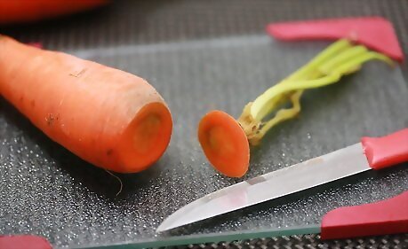 Freeze your extra carrots. Remove any carrot tops. Wash and peel the carrots. Blanch them in steam or boiling water to preserve taste. Cool and drain them right way. Freeze them in sealed containers with half an inch of headspace. You can freeze small carrots whole. Steam or boil them first for five minutes. Cut medium to large carrots into thin slices, lengthwise strips, or quarter-inch cubes. Steam or boil them for two minutes before freezing them.