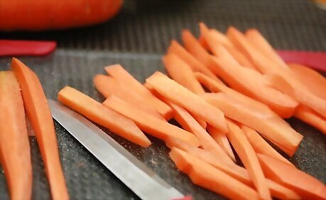 Use carrots to add a crunch to salads or sandwiches. Wash and peel the carrots. Then shred or julienne them. Add them to tossed salads, and/or as filling for sandwiches. Add whatever you like to your carrot sandwich! For example, hummus, yogurt, bean spread, spices, or raisins.