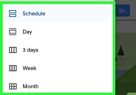Choose which dates to see. Your calendar will open to the current day, week, or month, depending on your settings. Here's how you can switch the view as needed: Mobile: Tap the three-line menu at the top-left corner, then select Day, 3 Day, Week, Month, or a different option to switch the view. Computer: Click the drop-down menu at the top-right corner (it should say Month by default) and select Day, Week, 7 days, or a different option.