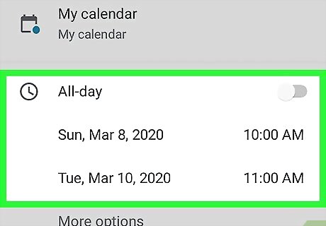 Select a date and time. Click or tap the dates and times to make your selections. The time zone is set automatically based on your computer, phone, or tablet, but you can adjust it if necessary. If the event will take up an entire day (or entire set of days), select "All day" at the top. If the event repeats more than once, you can set a schedule. Click or tap Does not repeat (you may have to tap More options first if you're on a phone or tablet) and choose the desired schedule. Tap Custom if you need to be enter a repeat schedule that's more specific.