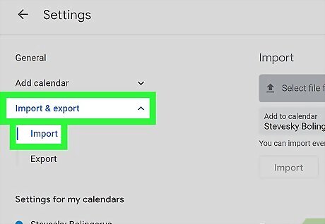 Import events from other calendars. If you're using another calendar on a computer that's capable of exporting events (such as Microsoft Outlook), you can incorporate them into your Google Calendar using the following steps: Open the other calendar application or website and select the Export option. If given the option, select CSV as the format to save the exported data (on a PC) or VCard (on a Mac). Open https://calendar.google.com on your computer. Click the gear icon and select Settings. Click Import & Export and select the exported file. Select a calendar to import to and click Import.
