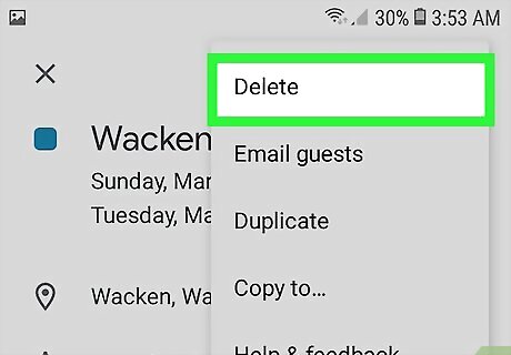 Delete an event. If you don't want an event to appear on your calendar, you can delete it easily. Click or tap the event to open it, then click the trash can or select the three-dot menu and tap Delete. Events that are automatically synced from other calendars cannot be deleted.
