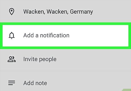 Create a notification for the event. Google Calendar will automatically send you a notification one day before the event, but you can change that if you wish. Use the menus to choose a notification time on your computer, or tap 1 day before in the mobile app to choose an alternative time.