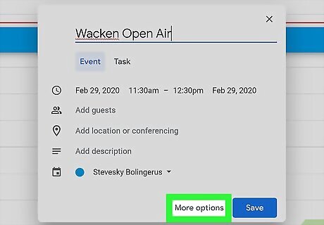 Click or tap Save. It's at the top-right corner. Your new event is now on your calendar.