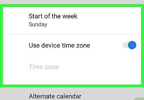 Customize your calendar's look and feel. To open your settings, click the gear icon at the top-right corner (on a computer) or tap the three-line menu at the top-left corner (phone or tablet), and then select Settings. Tap General on your phone or tablet to change the starting day of the week, time zone, default event settings, and more. If you're using a computer, Settings opens to the General tab, on which you can adjust your language, time zone, default event settings, and starting day of the week. Use the menu on the left to see additional settings. When using Google Calendar on a computer, you can customize some color and size options by selecting Density and color from the Settings menu.