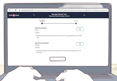 Book a tour ahead of time if you’re nervous about simply showing up. Look online to see which tour companies outside of Film City can actually get inside of the complex. Look at reviews to see what the tour company has access to before buying a ticket. Most people do not book tours in advance since it’s unclear when you’ll be allowed to get inside, but it’s an option if you really don’t want to risk missing out. This is usually more expensive than simply showing up at the gate. The most reputable company for getting into Film City is Bollywood Tourism. They’re the only government-registered tour company that takes travelers to Film City. This means that you’ll almost always be able to get you inside if you book through them.