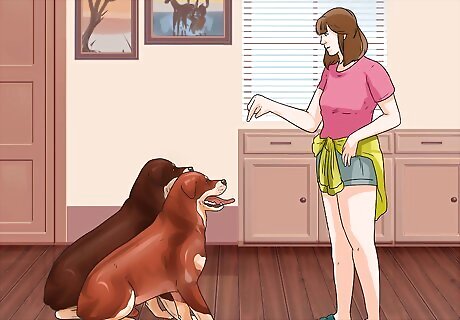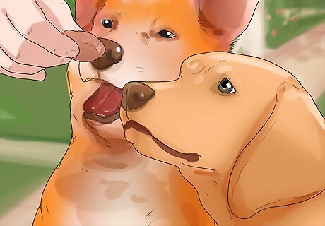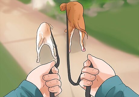 Correct competitive behaviors. Dogs may sometimes get competitive with one another during walking sessions. They may fight with one another to sniff a certain spot first, for example. Work to correct these behaviors as they occur to get your dogs to work well together during walks. You can correct problem behaviors as you would correct them when walking one dog. As soon as one or both dogs misbehave, stop dead in your tracks. Do not move until both dogs calm down.