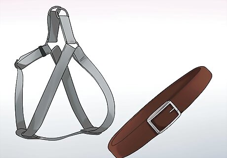 Get the right equipment. If you want to walk two dogs together, you must first train each dog individually. If one or both of your dogs are not leash-trained, walking them together will be very difficult. To start, leash train your dogs together. Make sure you have the right types of leashes and colors for effective training. When it comes to leashes, make sure you get two leashes of the same material. Leashes made from similar material are less likely to tangle. Leashes made from nylon, leather, and rope tend to work best for walking two dogs at once. Chain leashes or retractable leashes tangle easily when used together, so these are better avoided. When it comes to collars, you can use your dog's regular collar. However, if one or both of your dogs is new to leash training, consider a gentle leader. This fits over a dog's snout, preventing strain on the neck from pulling and allowing you more control as an owner. A walk harness may also work. If you're walking smaller dogs, opt for a harness since collars and standard leashes may hurt their necks.