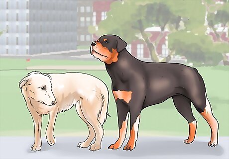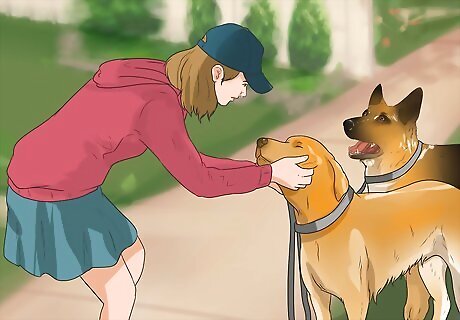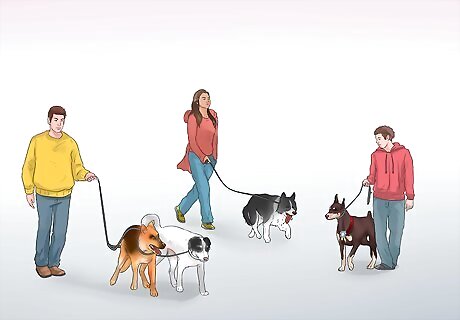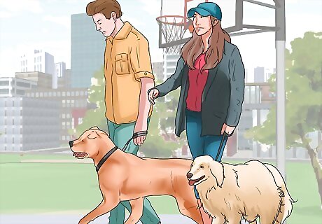Make sure your dogs are friendly with each other. If you want to walk your dogs together, make sure they get along first. If you've had both dogs for awhile, you may already know how well they get along. If your dogs are generally friendly with one another, they'll probably adapt well to walking together. If one dog is new, however, you may want to wait a bit before attempting to walk them together. They may need time to get used to another before they can be good walking companions. You should also make sure your dogs are friendly with other dogs. If your dogs sometimes get territorial on their own during walks, they may develop a pack mentality when walking together. This can result in a lot of aggression. If one or both of your dogs tends to be territorial, keep in mind you'll have to quickly correct any aggressive behavior during the walk.