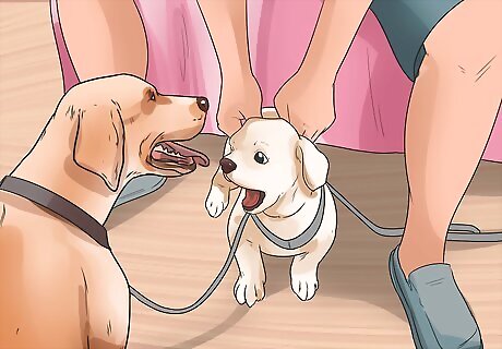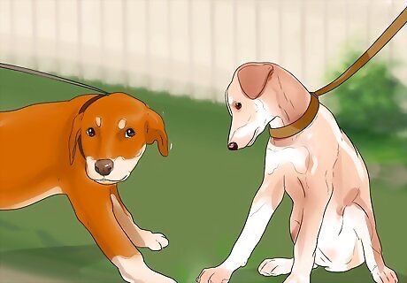Introduce two dogs gradually. If you have a new dog in your home, gradually introduce him to other pets. You should do this well before you attempt to walk your dogs together. Dogs are territorial by nature, and need time to adjust to a new family member. Keep the dogs separated at first. Allow the new dog free range of the house for only 15 to 20 minutes several times a day, at first. Allow the old dog to explore the house after the new dog is put away. This will let both dogs get used to one another's scent. The first face-to-face meeting should occur outside of the home. This will minimize potential aggression over territory. Keep both dogs on a leash and allow them to sniff one another and gradually make introductions.