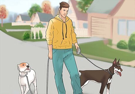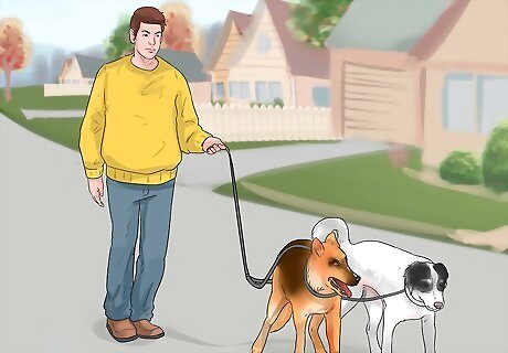 Build up to busier areas and longer walks. As with leash training dogs alone, you'll gradually work your way up. Once your dogs are behaving well in a calm area, practice walking them on busier streets. Gradually increase the duration of walks. Over the course of a few weeks, experiment with different areas and walk your dogs a little longer each day. Eventually, they'll learn to cooperate together on a variety of types of walks.