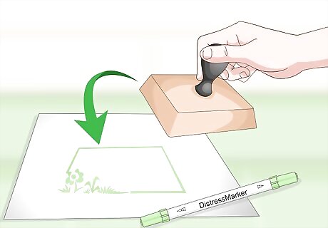 Use stamps. Using stamps with distress marker ink and water can help you to create personalized, handmade cards and stationery. You can use stamps as an outline for filling in an image with water color, or you can use distress marker ink directly on the stamp. If you're using a stamp as an outline, keep in mind that you're not necessarily limited by the lines the stamp makes. You can blend the colors across the lines of your drawing for a more natural look. If you're applying distress marker ink to the stamp, let the stamp ink dry before you then apply distress marker ink and water. Otherwise, the lines of the stamp will run. You can use a heat gun or hair dryer to speed up the drying process. If you mist the stamp before you apply ink, the lines of your stamped drawing will have a more watercolor look to them.
