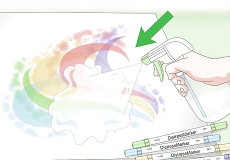 Spray the ink with water. Instead of using water to apply distress marker ink to the paper or painting water on top of the ink, you can try spraying ink with water. Apply the colored ink where you'd like it to go on your chosen paper, and then use a spray bottle to apply water to the page. This technique is particularly good if you're trying to achieve a rainbow look. Don't spray too close to the paper - if you do, you risk oversaturating the paper with water and causing the structure of the paper to break down. If your brush the color after you've sprayed it with water, you can achieve an ombre effect.