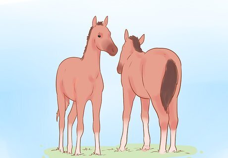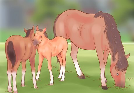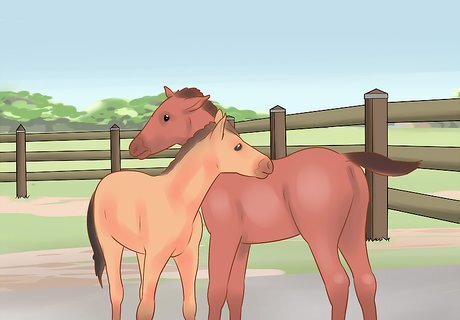 Find a friend or nanny for your foal after 4 months. In order to reduce the stress of being separated from its mother, find a friend or nanny for your foal that can keep it calm or distracted while it’s being weaned. Introduce your foal to another foal of the same age or an older horse when it’s 4 months old to begin bonding with it. Let your foal play in a paddock or pen with its mother and its new friend or nanny for an hour or so every few days while preparing to wean it. If you don’t have another horse or foal to keep your foal company, another animal may work as well. A goat, sheep, alpaca, or even a cat can keep your foal company and stop it from becoming overly stressed while weaning. Horses are naturally social animals so it’s cruel to keep them alone for long periods of time, especially while they are weaning.