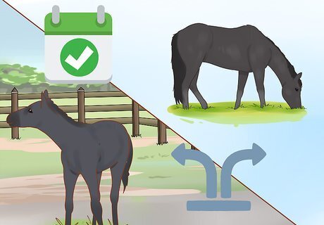 Double the separation time each day for a week. Feed the foal at around the same time each day in the stall or paddock, leading the mare out while it’s eating. Move the mare to the adjacent stall and keep it there for around 10 minutes. Repeat this process for around 1 week, doubling the amount of time they are separated for each day. If the foal begins to panic after being separated from its mother, avoid increasing the amount of time the next day. Keep the 2 horses separated for the same amount of time for another day so the foal can adjust to being apart from its mother for longer. On the second day, separate the foal and the mare for 10 minutes. You can then separate them for 20 minutes the third day, 40 minutes the fourth day, around 1 and a half hours the fifth day, 3 hours on the sixth day, and six hours on the last day of the week.