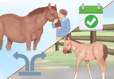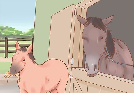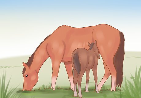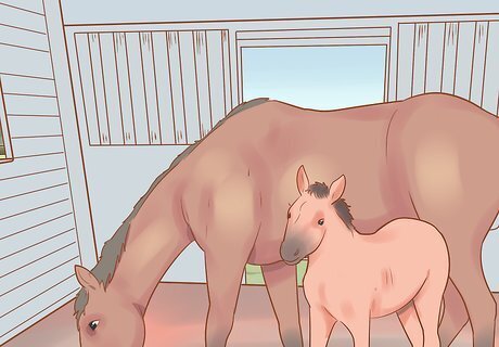 Give the foal time to calm down before introducing its friend or nanny. Each foal will respond to being weaned differently. Some may panic for only a few minutes, where others may take up to a day to calm down. Watch your foal to make sure it cannot escape from the pen or hurt itself on the fence. Feed it as you normally would and allow it to calm down naturally before introducing its companion to the pen. Check the edge of the fence for loose nails or anything else that could hurt your foal before weaning it. It will likely spend a lot of time near the edges of the pen trying to find its mother.