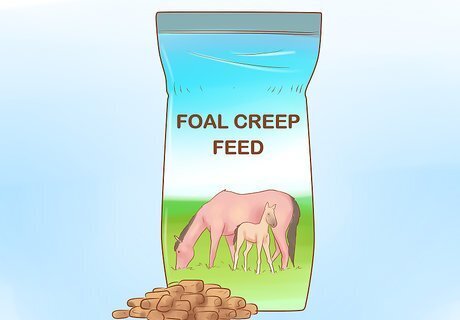 Feed your foal with creep feed after 4 months. When your foal is successfully weaned, it will stop relying on its mother’s milk for sustenance. At 4 months of age, your foal should begin grazing on grass. Many goals will have started nibbling or trying the mare’s food before you feed them with creep. At this point, start feeding it a “creep” feed designed for foals to begin weaning it away from a reliance on milk. ”Creep” feed is different from other types of horse feed. It is designed specifically for foals who are preparing to be weaned. Consult with your vet if you’re unsure what type of food you should be giving your foal. Many creep feeds will have guidance on the packaging to illustrate how quickly your foal should be gaining weight. Measure the height and weight of your foal regularly to make sure it is growing at the expected rate. If it isn’t, you may need to change the amount you’re feeding it or consult a vet.
