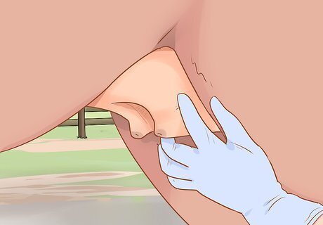 Check the mare’s mammary glands each day. After weaning, the mare will begin to dry up and stop producing milk. To make sure it does so properly and safely, look under the mare’s body each day to check the mammary glands stop producing milk and are not swollen or hot. If your mare’s mammary glands seem swollen, hot, or painful, contact your vet. Your mare may have mastitis, an infection of the mammary glands, and will need treatment to keep it healthy.