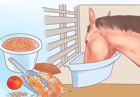 Reduce the mare’s food for 7 to 10 days after separation. When it’s separated from its foal, the mare will stop needing to create and produce milk. To facilitate this, reduce the amount of grain you are feeding it for 7 to 10 days after you move it to its own paddock. This will prevent the mare from being able to produce milk and keep it from gaining weight. Cut down your mare's food to at least half of what it would normally eat. To make sure your mare stops lactating, you can stop feeding it entirely. It will be able to graze on grass in its paddock while it's hungry.