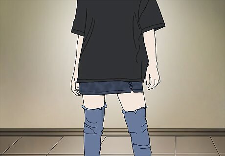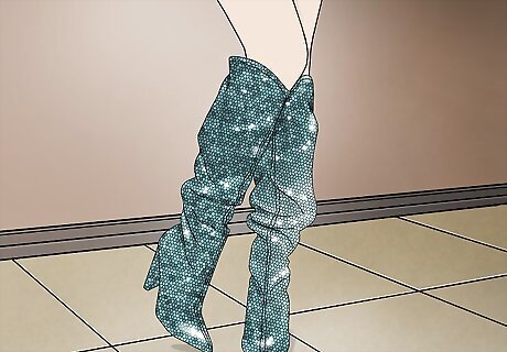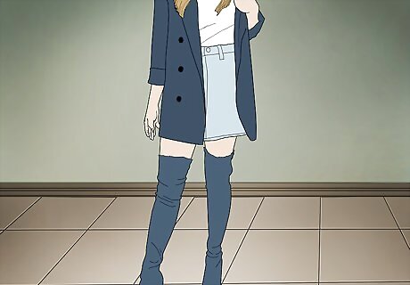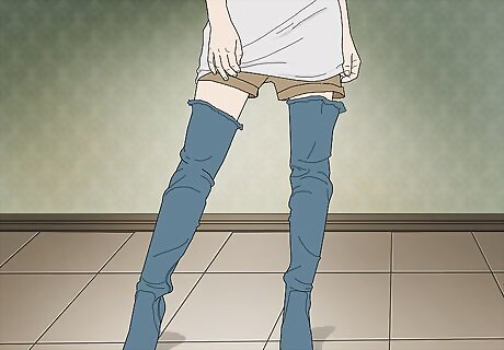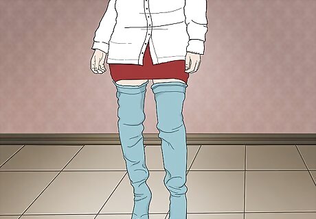 Dress your thigh-high boots up with an oversized button-up and short shorts. If you’re going fancier, swap your t-shirt out for a button-up to bring in a classic, clean element. Let a pair of short shorts or a miniskirt peek out from underneath your button up to complete the look. Try Wearing a crisp white oversized button-up, a red leather mini skirt, and distressed stiletto thigh-highs.