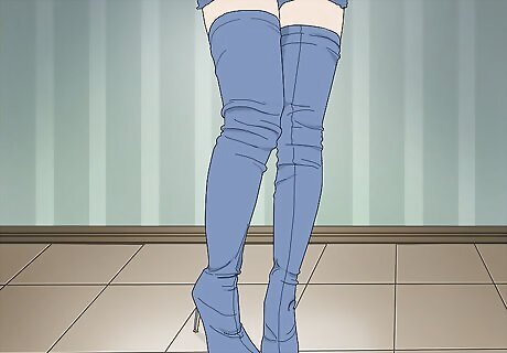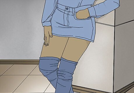 Pair your boots with darker neutrals for a sleek look. Denim boots can clash with vibrant colors and busy patterns. Opt for solid-colored, dark neutral-colored clothes instead. Tops, dresses, skirts, and shorts that are solid black or charcoal can be paired with your boots for a daring dressy nighttime look. On a night out, consider wearing a solid black strapless bodycon dress with a stretchy, fitted pair of stiletto thigh highs.
