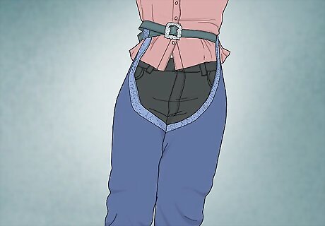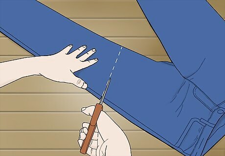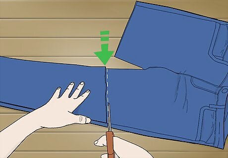 Cut off the legs of an old pair or jeans at about mid thigh. Lay a pair of jeans out flat and pick a spot between the knee and the crotch area where you’d like the top of your boot to be. Then, use scissors to cut a straight horizontal line across the pant leg at this point.
