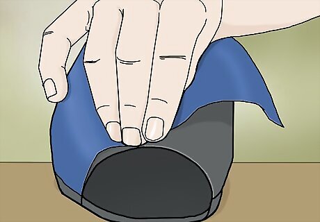Glue the piece of fabric to the sides and bottom of the shoe. With the piece of fabric still centered, squirt hot glue along the edge of the sole on both sides of the shoe and press down. Fold the edges of the piece of fabric underneath the sole of the shoe and then glue the fabric to the shoe in this location as well.