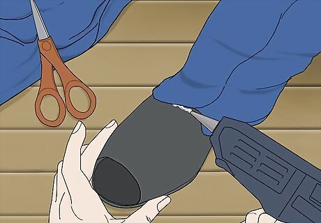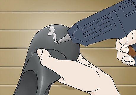 Take the shoe and pant leg off and glue a strip of denim around the heel. After the glue has dried, carefully pull the pant leg and shoe off. Cut another scrap piece of denim that’s long enough to cover the entire heel of your shoe. Then, wrap the strip tightly around the heel and glue it to itself with the hot glue gun. Cut off the excess fabric once the glue is dry.