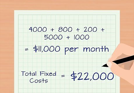 Combine total fixed costs. Fixed costs are those costs that don't change based on how many products you produce. This includes things like the rent on the building used to produce or sell the good, the cost of buying or maintaining manufacturing equipment, property taxes, and insurance. This can also include the cost of payroll for employees not directly involved in the manufacturing process. Sum these costs to determine total fixed costs. Going with our previous example, manufacturing 10,000 units in two months, let's say you spend $4,000 per month on rent for your manufacturing space, pay $800 per month in property taxes, $200 in insurance, $5,000 in non-manufacturing (administrative) wages, and $1,000 in depreciation expense on your machinery. This would total $11,000 per month in fixed expenses. Because you're measuring for two months, simply double this number to get $22,000 in total fixed costs. For more information, see how to calculate fixed cost. Keep in mind that this does not include any variable costs, or costs incurred based upon how many products you produce. Variable costs can be materials used in production, utilities, labor costs from manufacturing employees, and packaging expenses.